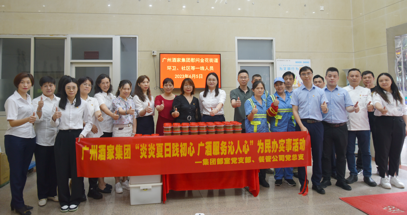 為深入開展學習貫徹習近平新時代中國特色社會主義思想主題教育,廣州酒家集團部室黨支部、餐管公司黨總支將主題教育與為群眾解難題、辦實事緊密結合,6月5日下午,聯合荔灣區金花街道開展“炎炎夏日踐初心 廣酒服務沁人心”慰問關愛一線人員活動,為奮戰在酷暑一線人員送去涼意,獻上關懷。集團黨委副書記、董事孫曉莉,集團部室黨支部書記楊青及雙方黨組織黨員代表參加本次活動。