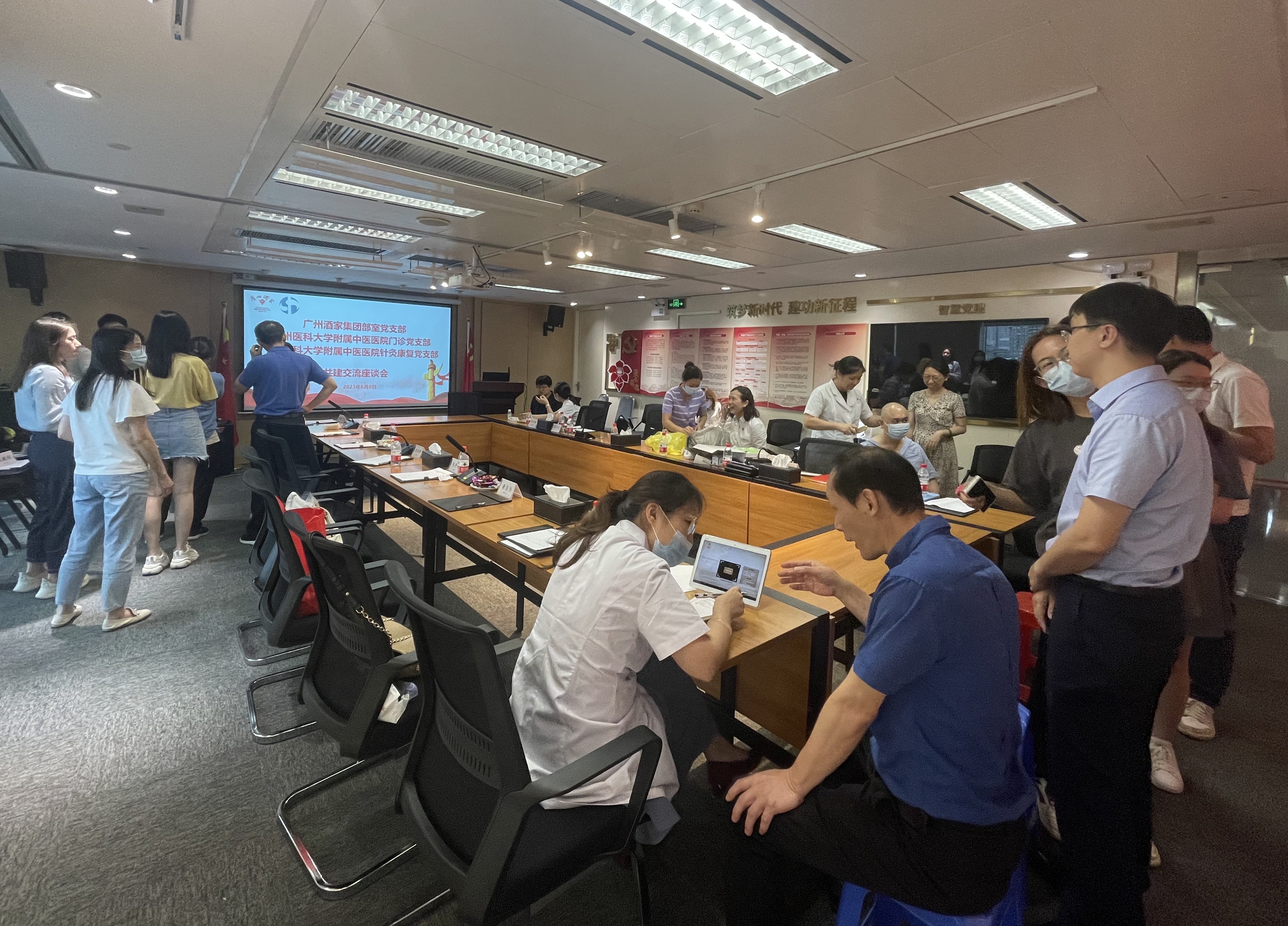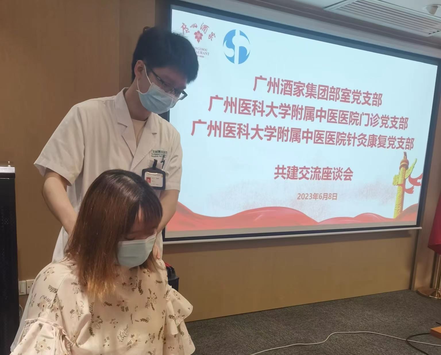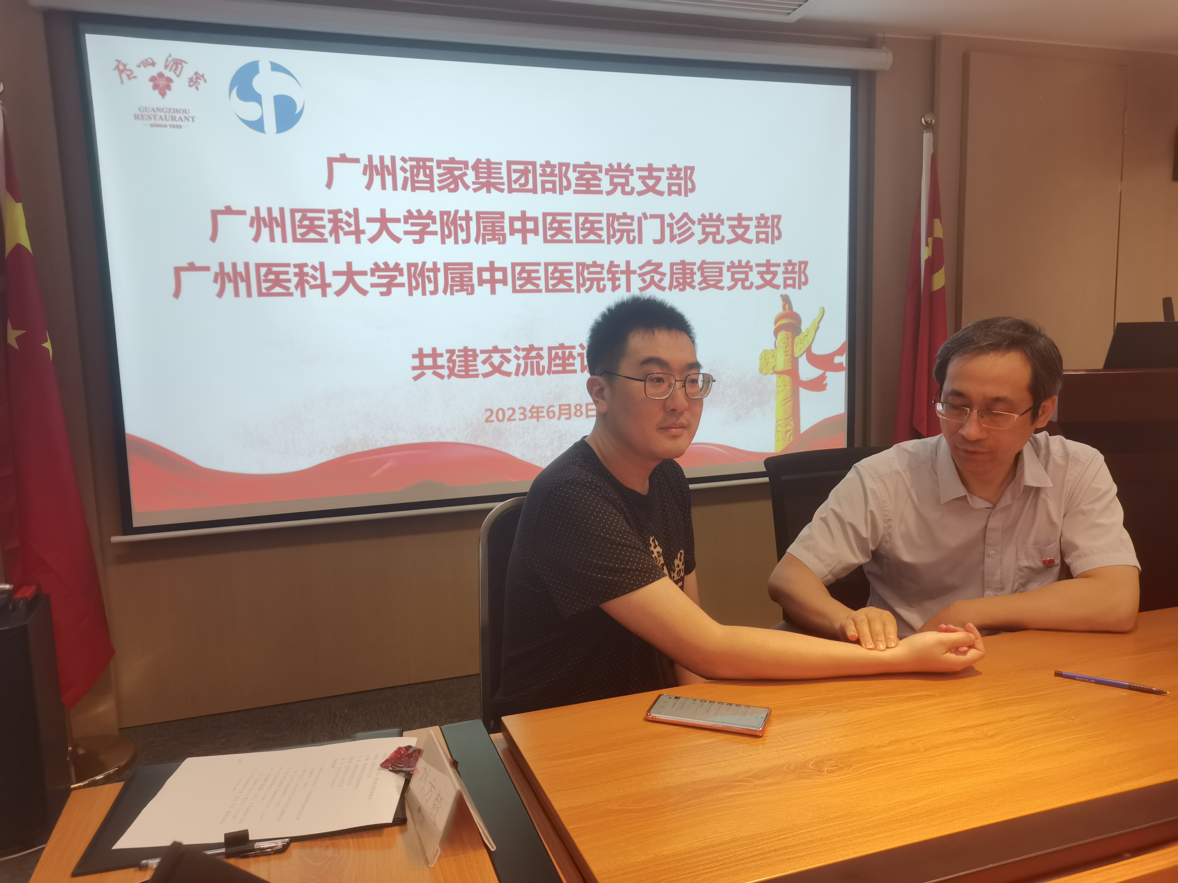 6月8日下午,廣州酒家集團(tuán)部室黨支部與廣州醫(yī)科大學(xué)附屬中醫(yī)醫(yī)院門(mén)診黨支部、針灸康復(fù)黨支部在集團(tuán)3號(hào)會(huì)議室舉辦黨建共建簽約儀式暨健康義診服務(wù)活動(dòng)。集團(tuán)黨委委員、副總經(jīng)理潘建國(guó),廣州醫(yī)科大學(xué)附屬中醫(yī)醫(yī)院黨委書(shū)記黃穎烽參加活動(dòng)。