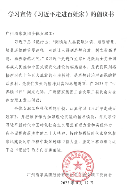 2023年4月,廣州酒家集團工會女職委向全體女職工發出倡議:“認真學習《習近平走進百姓家》,并把該書作為加強理論武裝的輔導讀物,深刻領悟習近平新時代中國特色社會主義思想真理力量和實踐偉力,在全面貫徹落實黨的二十大精神,持續加強新時代家庭家教家風建設的新征程中凝聚磅礴巾幗力量,堅定不移沿著習近平總書記指引的方向奮勇前進。”