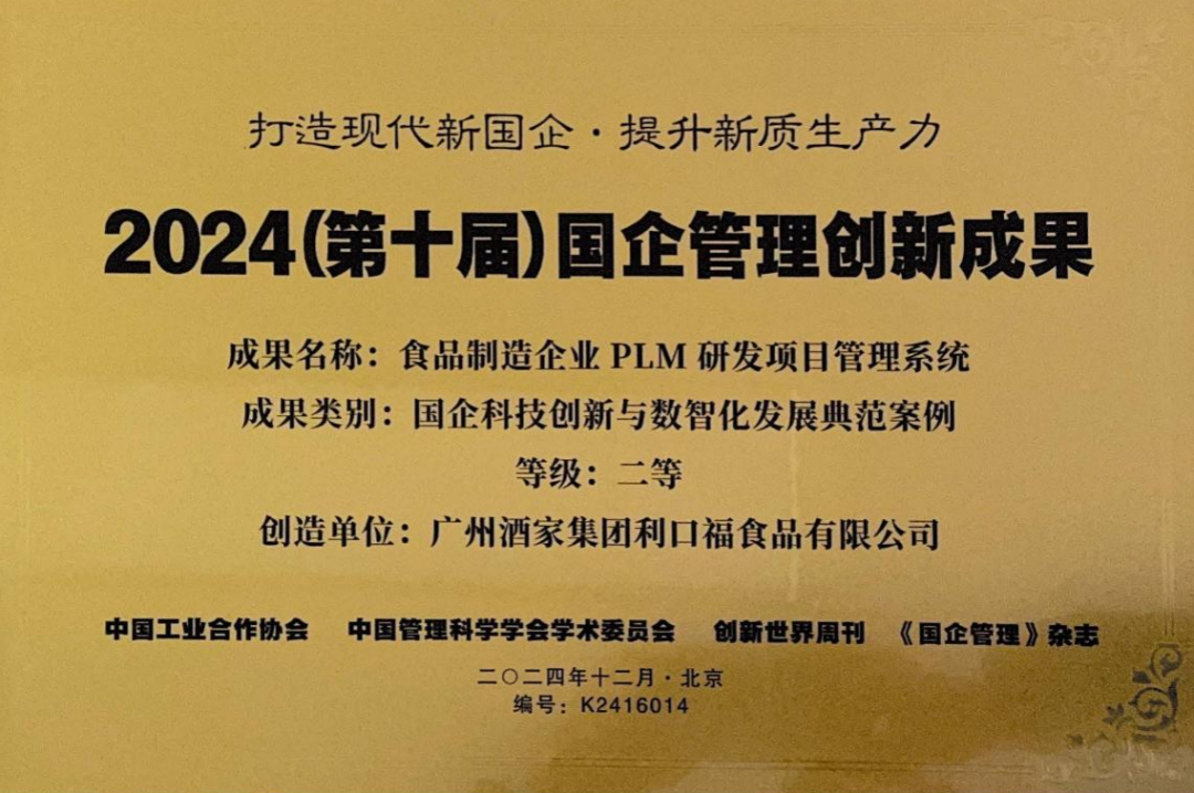 利口福公司堅持以數智轉型引領現代化產業體系建設,積極引入先進智能化設備和信息化管理系統,推動過百項智能制造與技術改造項目建設落地,優化升級產品全生命周期管理系統等數字化平臺,加快打造“智慧工廠”。其中,研發項目管理平臺(PLM)獲評“2024(第十屆)國企管理創新成果”二等獎。